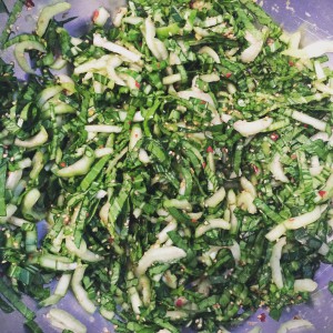 If you haven’t used the pak choi from last weeks share yet, give this quick, flavorful recipe a try. I used two heads of pak choi because I had one left over from last week but you can easily cut the dressing ingredients in half if you just have one. I plan to serve this with a quick ramen soup but I think it would be great with salmon or tofu and served on rice. I would suggest serving it immediately after tossing the pak choi with the dressing as it will start to wilt and soften fairly quickly.