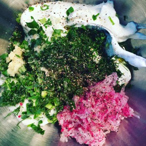 Wondering what to do with those beautiful daikon and turnip greens from last week’s share? If so, give this quick, easy and healthful dip a try. You can obviously use any type of green here but I love finding new ways to use greens that sometimes go to waste.